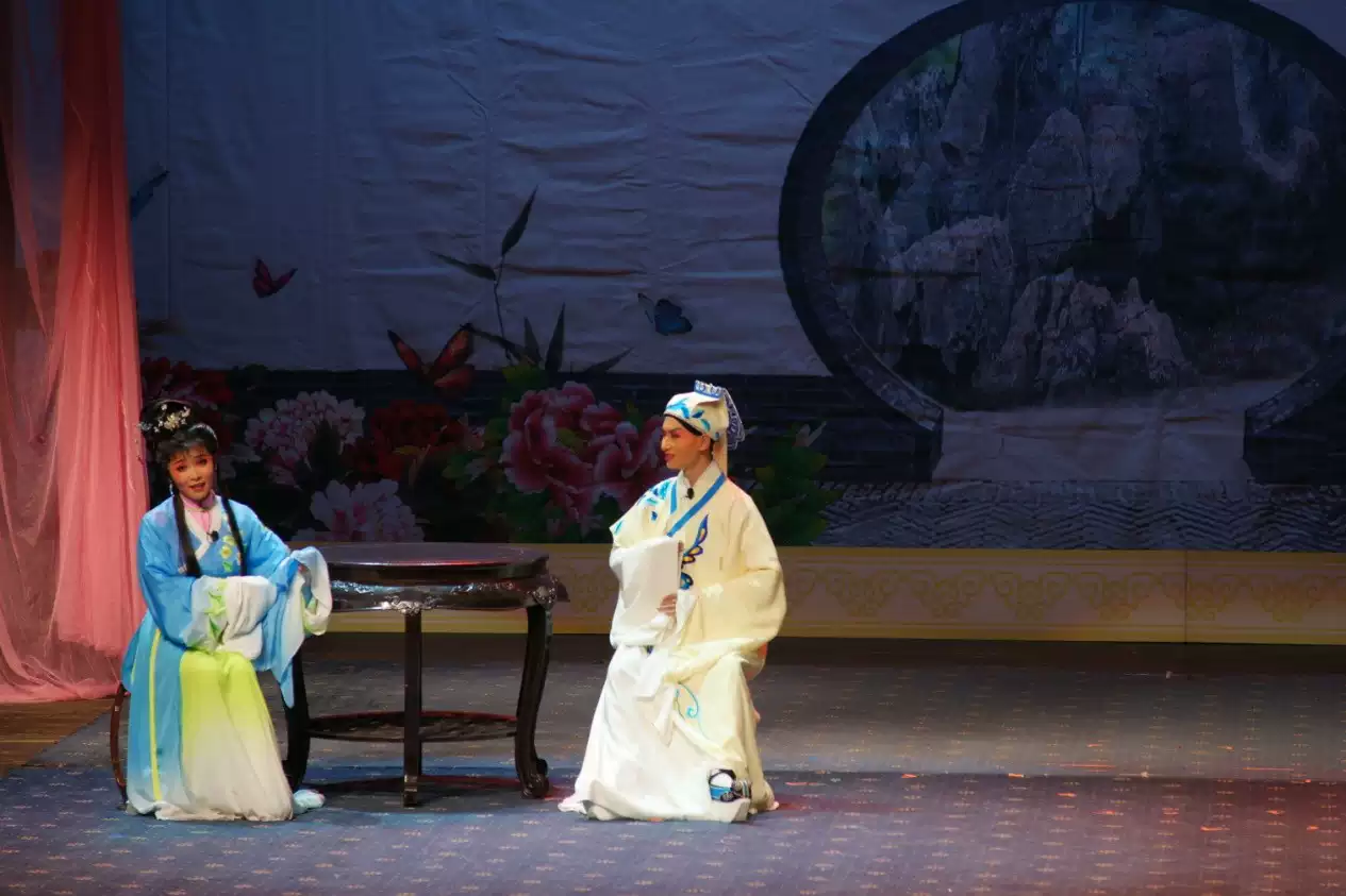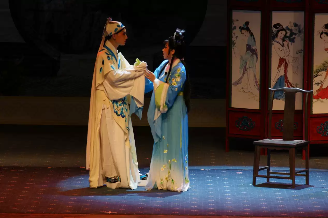 祝员外之女祝英台女扮男装去杭城求学,途中偶遇同去求学的梁山伯,两人一见如故,志趣相投,在草桥亭义结金兰,在书院两人朝夕相处,感情日深。